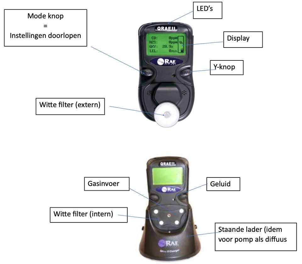 - Je het diffuus QRAE II toestel NIET aan een koordje naar beneden mag hangen maar gebruik moet maken van de accessoires voor vrijgave/betreden van een besloten ruimte zoals sampling hose slang (tot max. 25 meter) met balvlotter of probe.